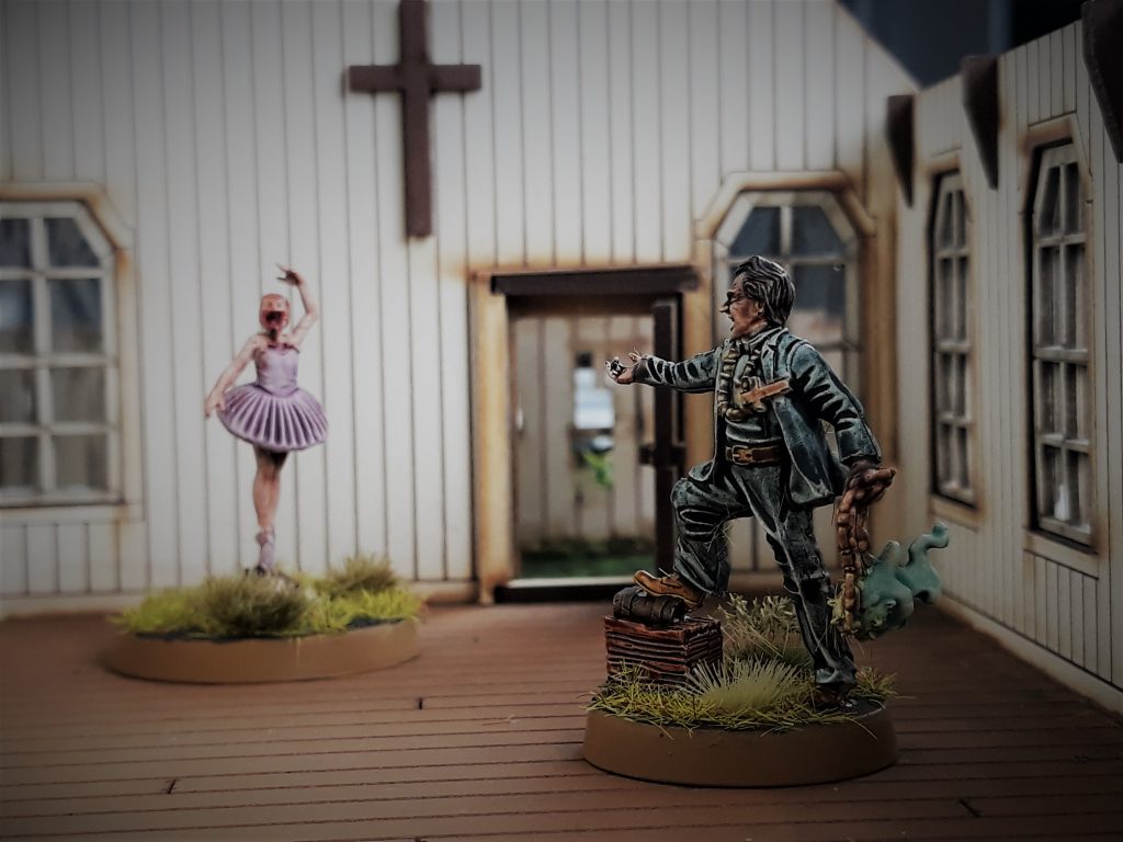 "We all go a little mad sometimes."Every game starts by choosing a scenario. The playing surface of 3x3 is divided into 4 quadrants, and fright tokens, points of interest or other scenario necessities are placed. This is also where you have to get the vibe right. It is possible to play this under the sterile glare of neon with 2d terrain and paper cut outs. Will it be fun? Yes, but it won’t do it justice. You’ll be needing a bunch of scenery, and most scenarios can be adjusted to things you have in your collection. This is also where the game shines; there are 5 scenarios provided, which get a particular inspiration like “investigate and banish”, giving you a sandbox to tweak the table to your own preference. After setting up the table and probably putting Monster Mash on repeat, you start off with the Fright Phase.