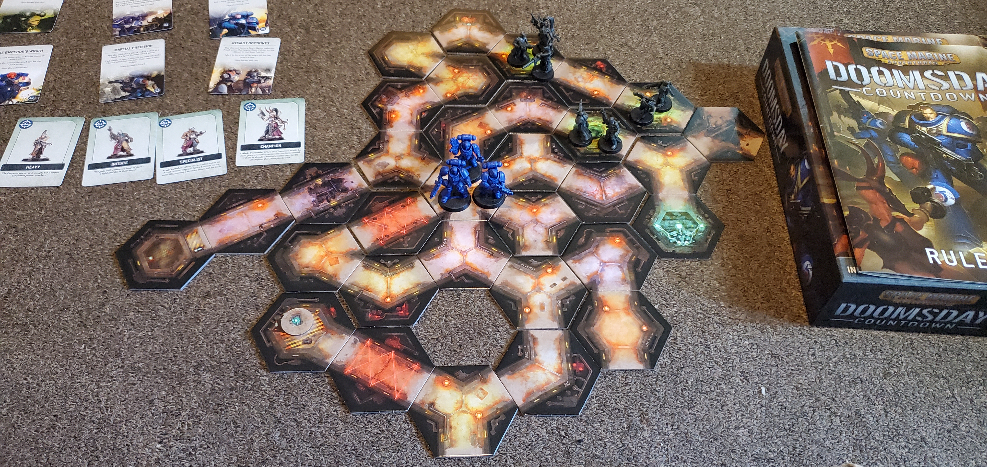 Setup for the game is fairly simple. Each player takes a Space Marine with a unique ability. If there are 2 players one takes control of two of them while in solo play you simply control all 3. Each player is randomly dealt 2 Wargear cards that grant one time use abilities like the ability to add +1 to hit rolls or heal a wound. Finally the board is set up. A center hex is placed allowing you to branch off into 6 directions, though 3 additional starting hexes are always placed to get you started. Then a player shuffles up all the hexes and plants them until every the hexes are down and connected into a randomly generated maze. The defuse code is placed on the specifically marked hex and finally, cultists are placed on one of three "spawn points". Set the counter to 20 and off to the races you go.Gameplay
