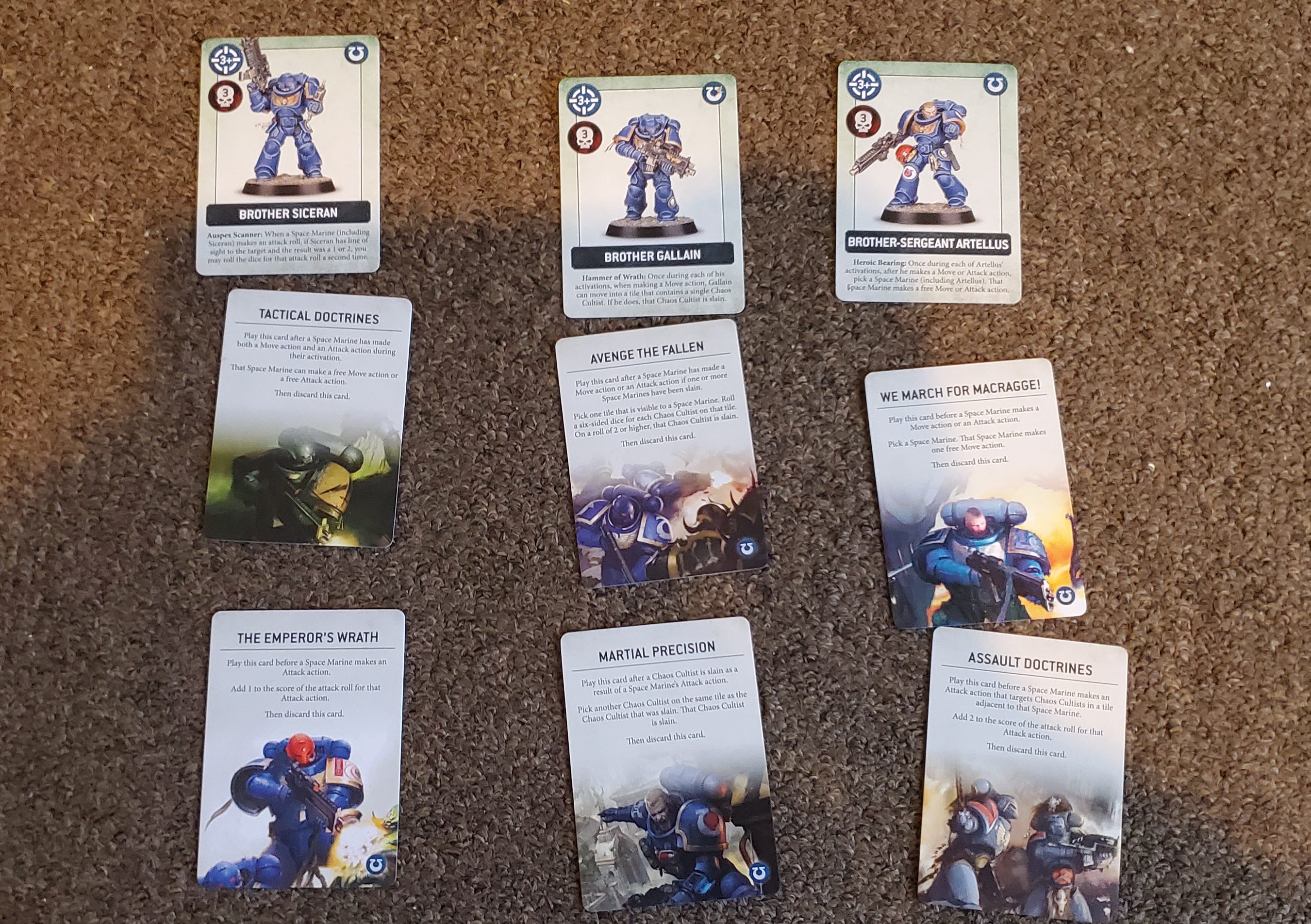 The gameplay is very simple and works both to the games benefit and detriment. Each turn the players go first, and each Marine gets 3 actions (though there many ways to get free actions). Generally these boil down to move or shoot, but you can also use one of your actions to seal up one of the spawn points for chaos cultists (so no more can come in), pick up the defuse code and defuse the bomb. After all 3 players have finished their actions the cultists go. Cultists actions are resolved by drawing a card and then having every cultist resolve it to the best of their ability. Usually it's something like move twice, move and shoot or even a sneaky one where planted explosives go off, potentially harming all 3 marines regardless of location. Once that's done, any dead cultists are spawned (if possible) and the clock ticks down by 1.The game is over once all the Marines are dead, or the primary objectives are completed. These are: