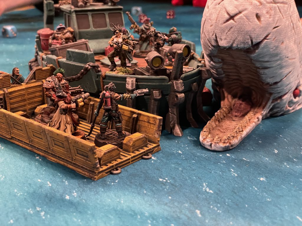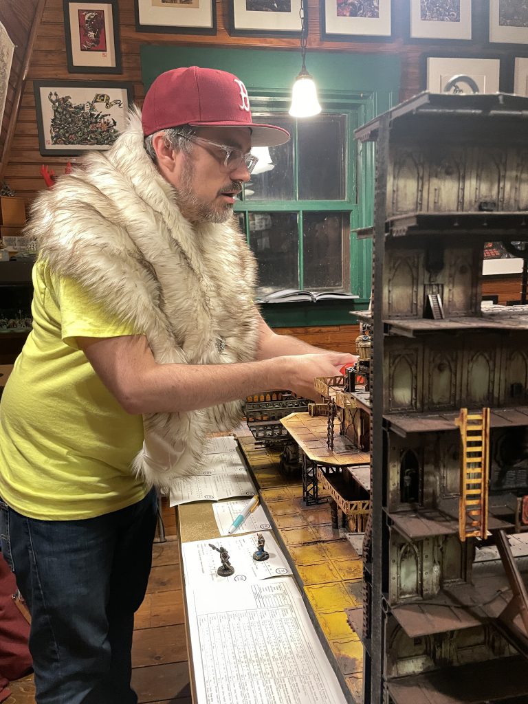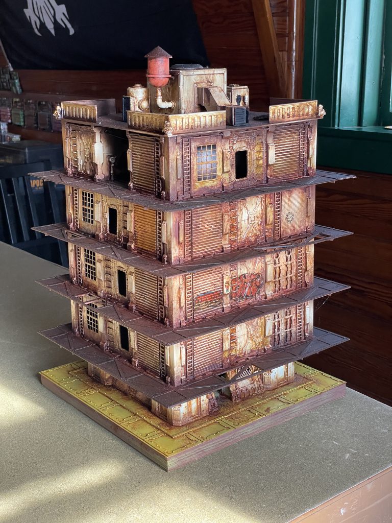 I finally got to painting my hab block. It had been primed for a while, so I just needed to spend time with oil paints. Have I actually finished it? Nope. I still need to oil the underside of the walkways. But I got it done-enough for the event in May and, in the process, learned that I need to make some clip-on barricades to make it more playable and not the hellish deathtrap that it currently is for gangers. It rips though and absolutely dominates the table.