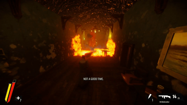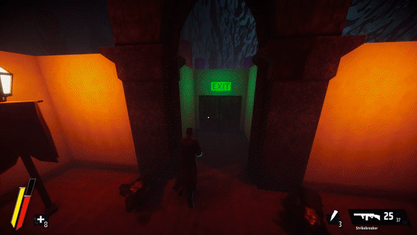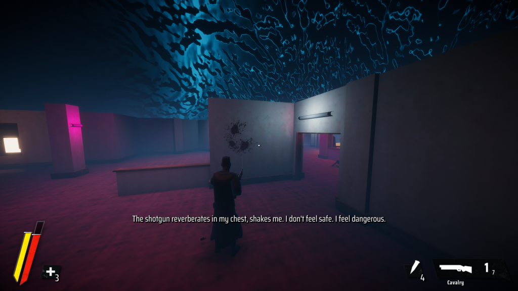 El Paso, Elsewhere is a third-person shooter that places you in the well worn shoes of James Savage, a vampire hunter and recovering addict, whose vampire ex Draculae is trying to bring about the end of the world via an ancient vampiric ritual beneath a motel in his home town of El Paso Texas. Starting at the front desk you are met with familiar sights of a stodgy motel which quickly give way to more surreal environments as the fabric of reality is stretched to its absolute limits. El Paso’s Max Payne influences are worn on its sleeves and it never shies away from reveling in them. The story is conveyed primarily through James' neo-noir monologues between floors or levels. James himself is a pill addict and during gameplay consuming pills is our means of recovering hp and of course there’s all the bullet time slow-mo diving that makeup the majority of the game's combat.