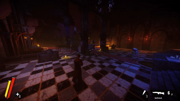 The main loop of each floor is going from room to room in increasingly surreal maps from motel rooms,castles, graveyards and amalgamations of all 3 all the while beasts of all kinds are sent to stop you. Some levels require you to rescue Innocents with enemies spawning after each is rescued. When the last innocent is rescued it's time for a mad dash back to the elevator as the level. Sometimes levels will have doors with a colored aura matching the various color coded hearts in the level. These hearts act as keycards in Doom or other retro shooters allowing you access through their matching colored door