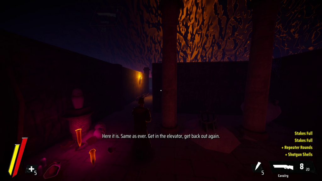 The relationship between James and Draculae is revealed slowly throughout the game both through James’ monologues between floors and audio logs you can encounter in the levels themselves. The voice acting for both our intrepid vampire hunter James and antagonist vampire Draculae are fantastic when the two finally share the screen in the present narrative, their interactions together are gripping and made all the more compelling by what gets built up in the scenes prior. There were moments in the pairs' exchanges that floored me with how painfully familiar they were.