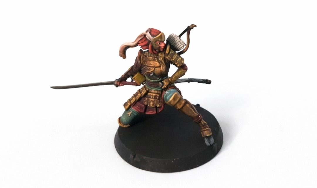 Eldfall Chronicles Imperial Banner- By Blake LawBlake Law: I went with an overall samurai color theme with these guys. I did gold on the armor. The base here is Scalecolor Decayed Metal, to Scalecolor Viking Gold, to ProAcryl Bright Gold. I finelined it with GW Snakebite Leather contrast. I created shadows with AP Fanatic Sepia and Burnt Umber ink. My silver is done using ProAcryl Dark Silver, Steel, and Silver.