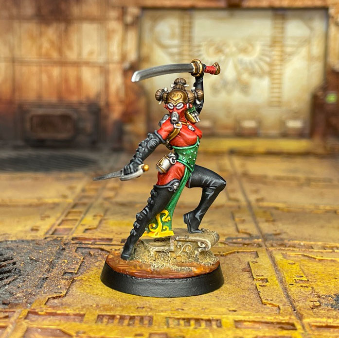The team's melee powerhouse. With 3APL, a 5+ invulnerable and a raft of abilities, and a unique action, she has the punch to win fights and to use orders on the way in or out of melee to stay alive.The Dartmask is an interesting 6” range Silent weapon, which while it only does 1/1 damage is Lethal 5+ with a Stun critical effect. In melee the much more damaging power weapon comes out, and 5 dice with 2+ to hit and Lethal 5+ means a lot of hits and a good chance of criticals.
