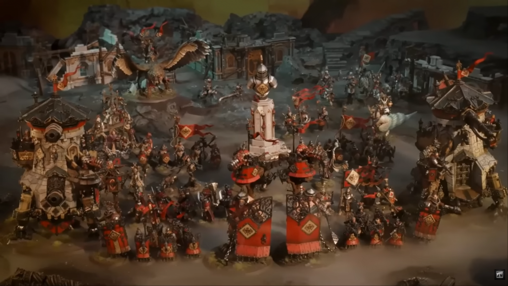As for said humans, though, this wave has made many a convert to the Dawnbringer Crusades, I can tell you that much. Two new types of infantry, the versatile Grenadiers and inspiring Gallants, both join the fray as ways for Freeguild-centered armies to better contest the midboard...beyond swarming it with bodies. Gate Gargants meanwhile serve as the undisputed king and queen of holding the line, as upsized versions of the Fusil-Major you now take as a unit. My fingers are crossed we get some flavorful rule about moving between the two bases, but it's far too early to say. All of us are here for one reason, though, and that's AoS' second take on a Knight-style unit, the Cogfort. Available in both ranged-centric Cannonade and melee-transport Conqueror varieties, these are explicitly able to be taken in any army as a Regiment of Renown, because frankly no matter what you're playing, it's likely you want one. Look at the thing, it's gorgeous! As someone who's adored conversions for my entire Warhammer tenure, possibilities surge through my mind at the thought of kitbashing one of these up (until I remember I played, past tense, Beasts of Chaos). Centerpieces like this are what AoS is made of, and I cannot wait to see amazing modellers and painters get their hands on one of these gigantic things. As a final note, also included was faction terrain, as everyone's now getting, in the form of the Dawner's Triumph, and yet another foot hero intended to bless a Cogfort, your Mallus Forgepriest. Neither excite me immensely, but your mileage may vary.