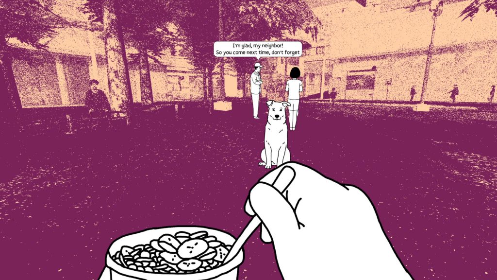 What draws me immediately is the art style – Quito is lovingly recreated and put through this hazy, aged dotted-pen style that’s contrasted by the boldly, yet simplistically, caricatures of people. It puts you in the mindset of a memory – you remember the specifics. The football you kicked around. The friends you played with. The people you knew. They stand out because they remain strong in your mind, while where you were fades with time. Where not as important as the who, when it comes to those childhood memories most the time.