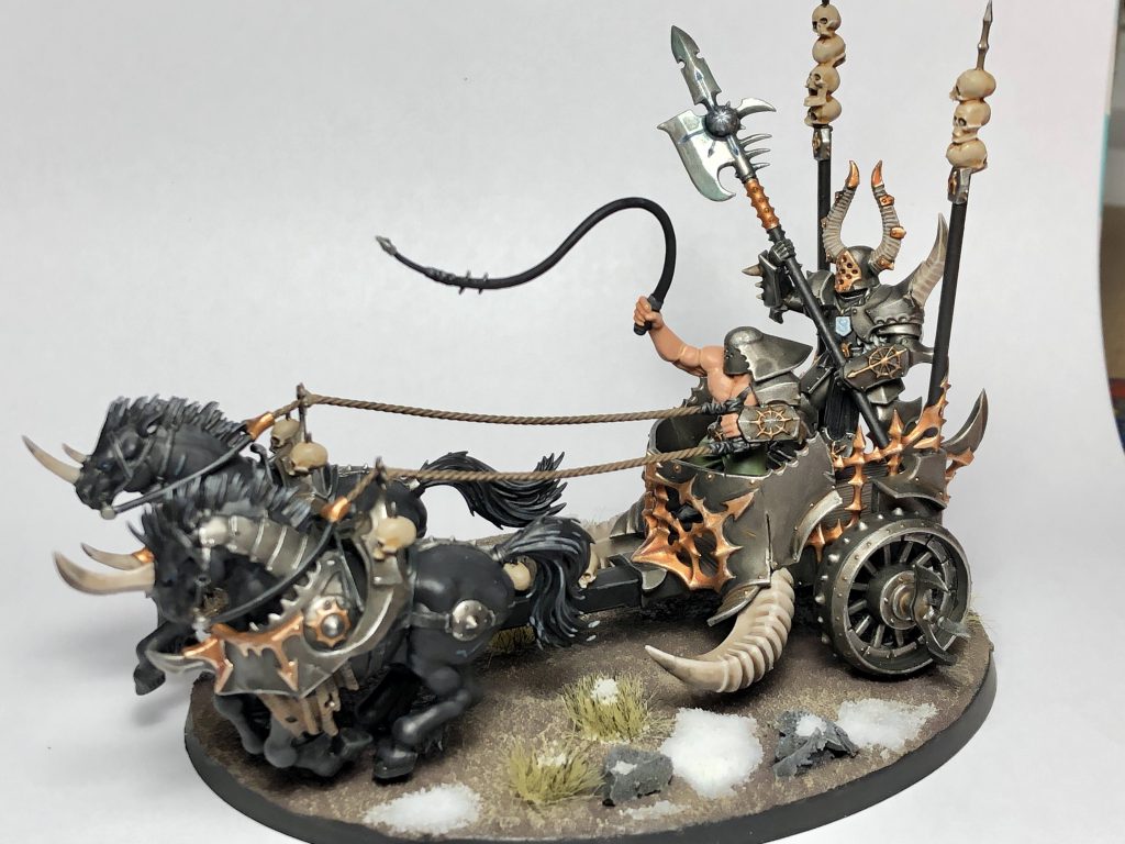 On the table he's quite nasty, granting you an extra CP each round, a 4+ Ward against mortal wounds (With the ability to kick it back in a 6+ in close quarters) and a mount with a couple different powers. He gets 2 spells and while he has no spells of his own, the Slaves to Darkness lore is quite good, particularly Call to Glory. His melee stats are solid and the Slayer of Kings can instant merc a Hero, great for some of the other gods with nasty Ward saves.