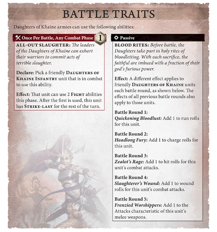 Credit - Games WorkshopThe main mechanic behind the Daughters of Khaine is the Blood Rites ability. As the game goes on they receive stacking bonuses such as +1 to run, +1 to charge, +1 to hit, +1 to wound, and finally +1 attacks in the last round, meaning DoK units will be in your opponent’s business early and often. This is a very powerful ability with the early abilities helping them get into combat and the later abilities helping the remnants of your forces keep up the fight.