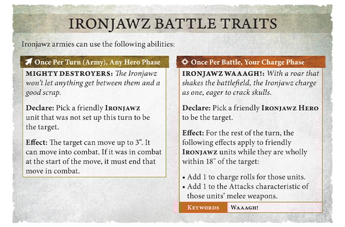Ironjawz are all about getting to the fight and, well, fighting. Each turn a unit gets a free 3” move in your hero phase which can either start in or out of combat; if it started out of combat it’s allowed to move into combat but if it started in combat it has to end in combat too. It doesn’t have to finish the move in combat with the same enemy unit though, it’s not a pile in move, and being able to tag enemy units in their hero phase before they get a chance to move can be big. Their other trait is a once per game WAAAGH!! giving friendly units wholly within 18” of the hero calling it +1 to charge rolls and +1 attack with melee weapons. This will typically be used early in the game while you still have most of your units on the table for full effect. As a once per game ability though it would have been nice to be table-wide and not just within shouting distance of one orruk.