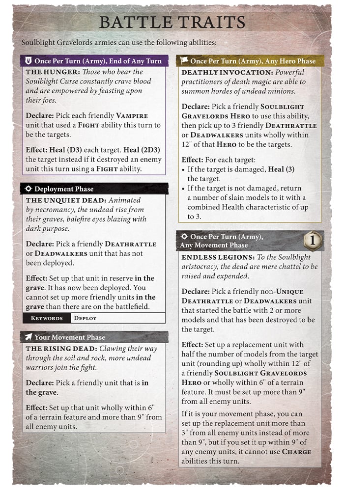 These abilities are split between movement, healing and resurrection. Notably, gravesites are no longer a thing and your Deathrattle and Deadwalker units can now be deployed from terrain features (that’s both arriving from reserve or getting recycled via Endless Legions). This is honestly a nice quality of life change for both players and puts a rest to the silliness that could happen in the mirror. Endless Legions itself going back to the old Legions of Nagas style command point rather than being a dice roll is also a huge quality of life change for the army, watching players fail that roll turn after turn was always painful.
