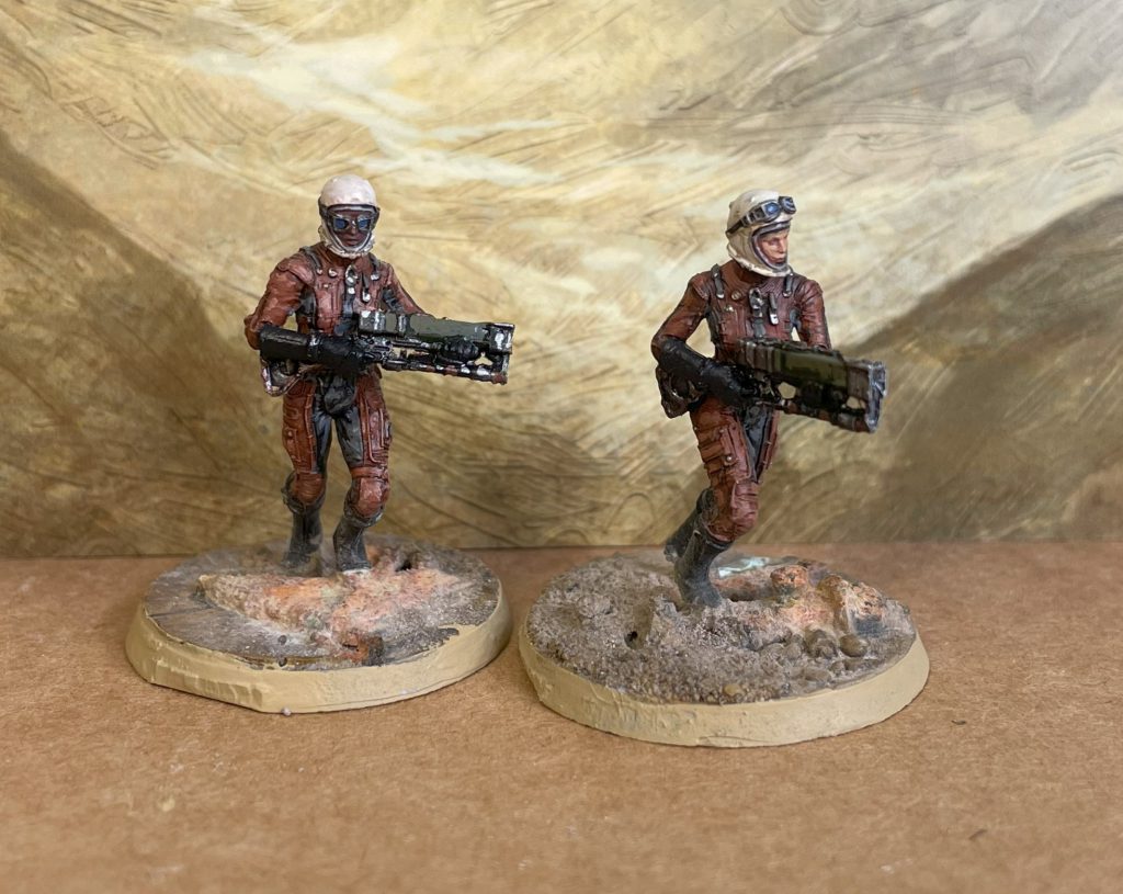 Shim I could remove (left), one I was too chicken to try (right) Fallout Brotherhood of Steel. Credit: LenoonOne thing to point out here though - goddamn do I hate resin bases. I went to file these smooth after slicing them off the sprue and then thought "there's nowhere in my house I can safely file resin" and then plain forgot to do them outside. The detail on top of all the resin bases is great, and if you've got a mask go for filing them smooth. Personally I really don't like them.