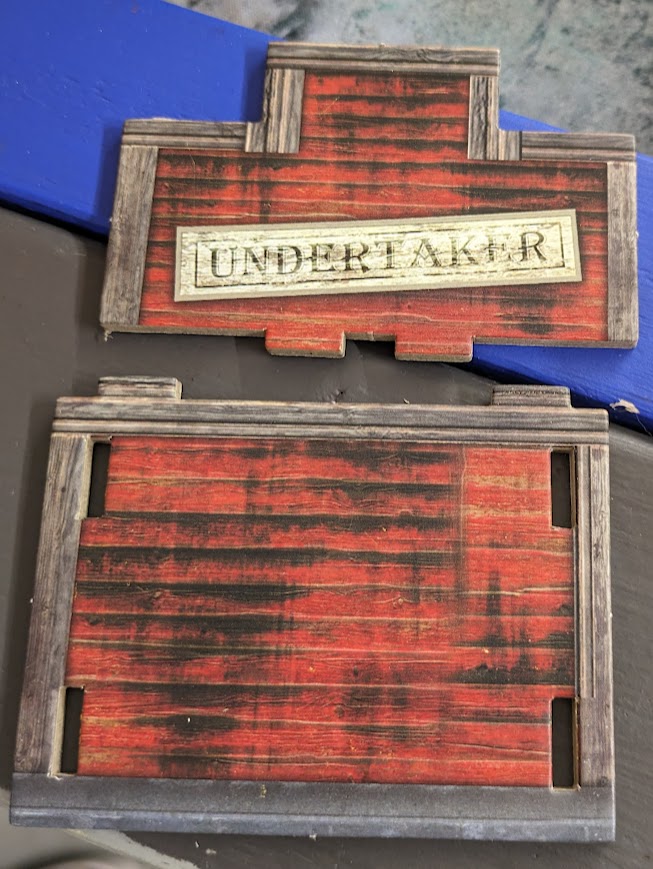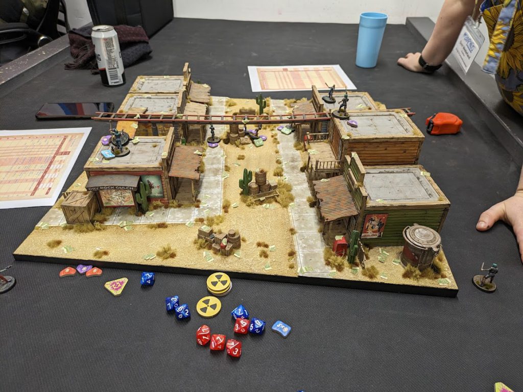 Dissembled terrain from the core Fallout Factions box. Credit: LupeThe terrain is just really nice looking and is designed for the "wild west" themed section of the Nuka-World park, which is fun and thematic, and includes these kind of buildings as well as refreshment stands and other elements. But how does this actually look on the table? Well, one great move at the event was that they had a table made using some elements of the card terrain then upgraded and refined with their own STLs and scenic elements.