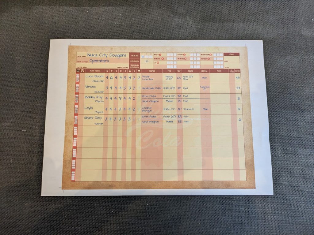 Fallout Factions roster. Credit: LupeAll of the information you need is on your roster sheet, which for this demo had five models on it, though a full game (played on a 2 foot by 3 foot board rather than the 2 foot by 2 foot demo boards we had) will have about twice as many models. That does mean that the core box contains two complete faction warbands - it's genuinely a core box that lets you play the full game right away. We'll come back to the box and what's in it, but to jump ahead a bit the core box seems like an insanely good offering and starting place.