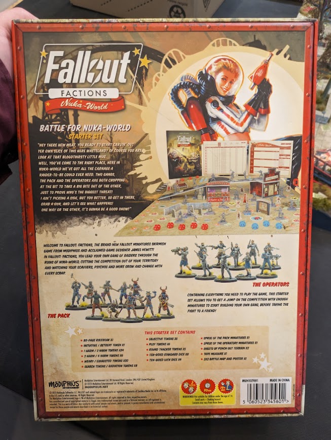 Fallout Faction Box Front. Credit: LupeThe box is a serious offering for the price point (£85/$110 direct, available at discount from third parties). It contains two full warbands, the Pack and the Operators, and these are genuinely complete warbands - ten minis each on sprues. The miniatures themselves are really nice, lots of detail and multipart plastics are a huge step up over the resin models that Modiphius has relied upon before in their Fallout ranges. This is a sea change, and I really hope they'll bring other factions (including those with existing models, like the Brotherhood of Steel), to the table in this material. Talking to staff at the event I was told that the ten models each warband have is enough to really pack out a full roster, and while you might expand beyond it sometime in the future it's absolutely fully optional and something that you'll only do after a lot of games under your belt, if ever.