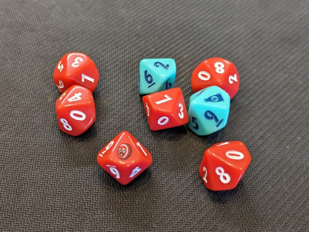 It's quick and easy, and I'd say my only critique here is that the ten-sided dice that are used have a 0 as the 10 on the dice, which is the norm but also might be confusing to very new players who are expecting it to count as a low result. I saw it catch a couple of people across the evening.