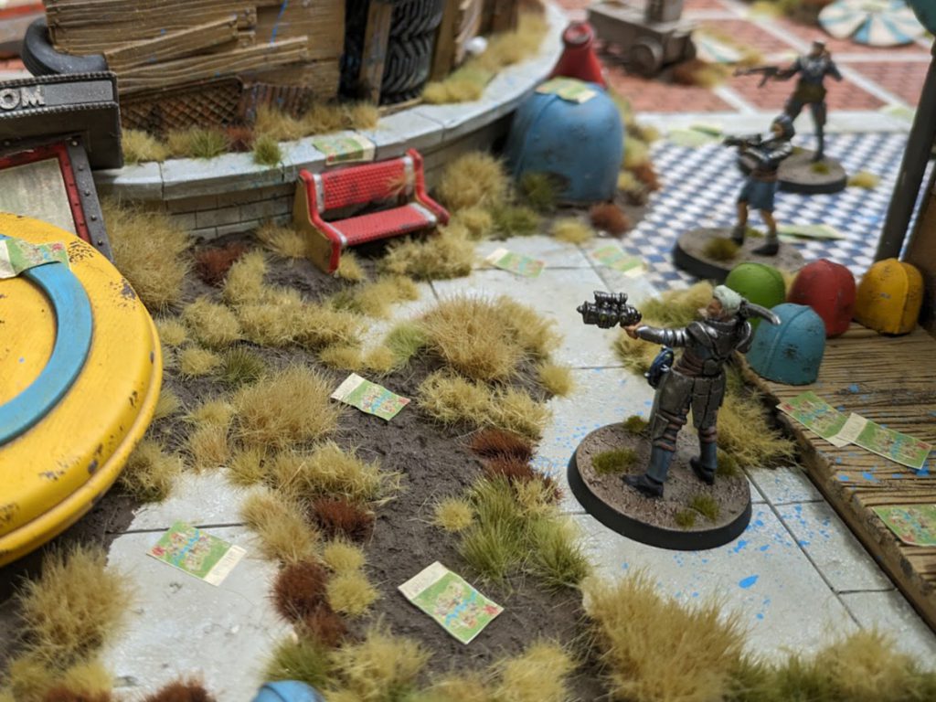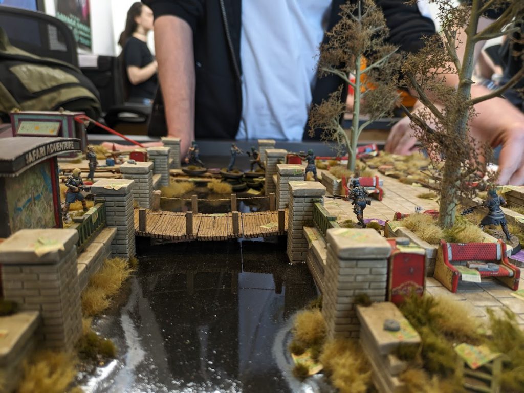 Fallout: Factions demo game in progress. Credit: LupeThe game I took part in was on this fabulous canal board with bridges running across. There aren't many terrain rules in the game - just impassable areas (the water was impassable) and elevated areas (that you need to spend movement to climb up the sides of to reach, but can jump off without slowing yourself down). It's barebones, but combined with the true line of sight rules it makes for fast but thematic gameplay: The terrain matters, but mostly only in terms of actually interacting with each other, not just slowing you down or causing other problems.