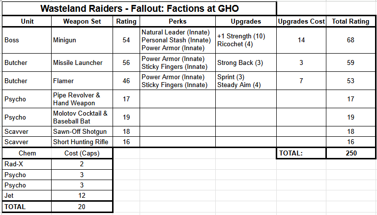 Cronch's Wasteland Raiders list. Credit: Rich NutterFinally, I chose my chem doses. I should have no problem scavenging up plentiful supplies in-game, so I opted for a spread. Psycho seems important to really amp up the power of my high-cost models and get my investment back, so two doses of that joined a Jet (the clearing of fatigue is just too tempting), with the final caps spent on a Rad-X in lieu of any other affordable option. I’m benefiting massively from my leader’s Personal Stash perk here, making every chem dose 3 creds cheaper.