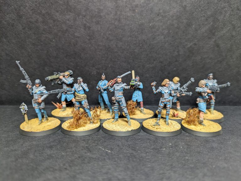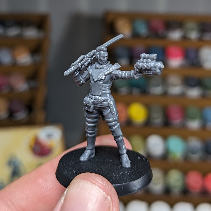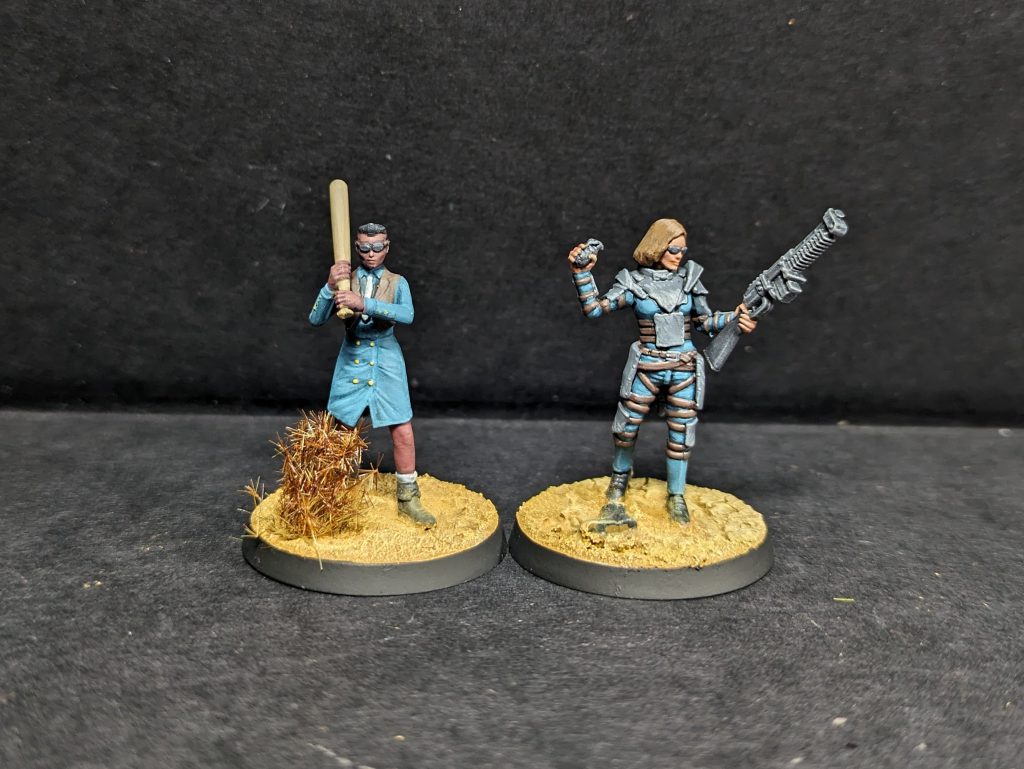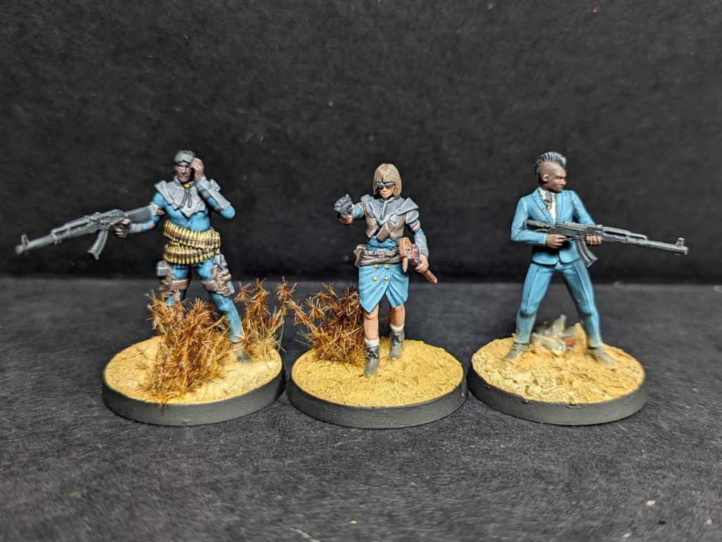 - Guns and Boots: Vallejo Black Grey, with highlights of 1:1 Black Grey:Neutral Grey on boots, and a drybrush of Neutral Grey over guns