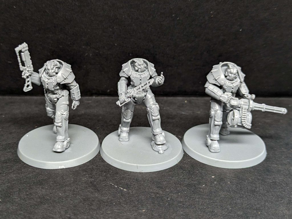 X-01 power armor assembled and ready for priming. Credit: LupeEach model is a distinct pose, and though there are head and weapon options they can really only be built in one specific pose, so while the trio look great if you did want more than three, you'd probably want to kitbash them a little for variety. That's a pretty unlikely scenario though, considering the role these play, so I think it's fine.