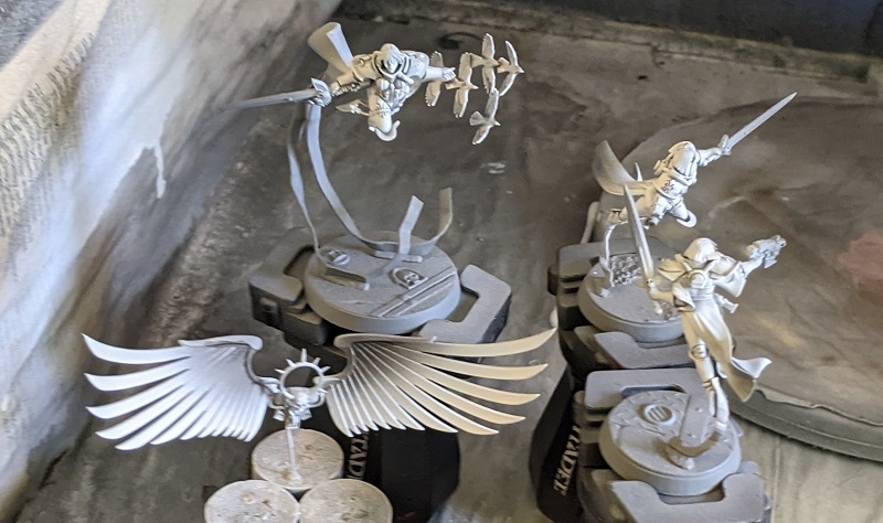 Credit: Evan "Felime" SiefringDuring the first week that composed this most recent "week" I assembled the bulk of the remaining normal sisters of battle for my army and airbrushed them with my usual style. (Grey Primer, Ulthuan Grey, White.) And no, I wasn't flossing my teeth. Picks make good mixing and cleaning tools for an airbrush and I have them in the bathroom closet anyways. I also got Celestine and a Dogmata airbrushed, which is my secret plan to try to catch up on PL.