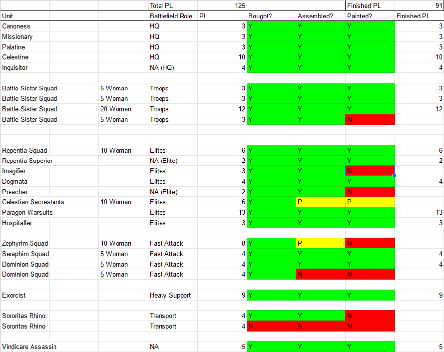 Credit: Evan "Felime" SiefringThat big block of sisters basically allowed me to fill out the 20 woman squad (Stealing a few bolters from one other squad to fill it out,) as well as complete a Dominion Squad, Dogmata, and Celestine herself. That gives us a score for the 'week' of...