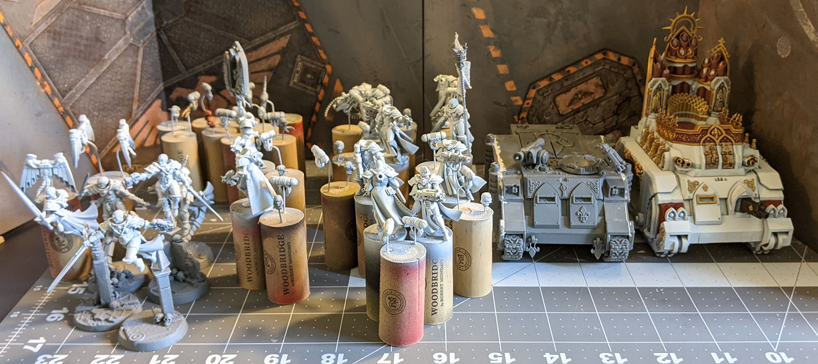 And then. Uh... well... I was rudely reminded that modern Sororitas models are nontrivial to assemble. I can't just bash out cleaning and assembling 10 model squad of them in half an hour like I could Cadians, at least to a standard of quality I'm comfortable with. I put together a few more infantry models (not pictured) and then did a batch of panel lining on some primed and airbrushed models that will be joining me at Goonhammer Open.