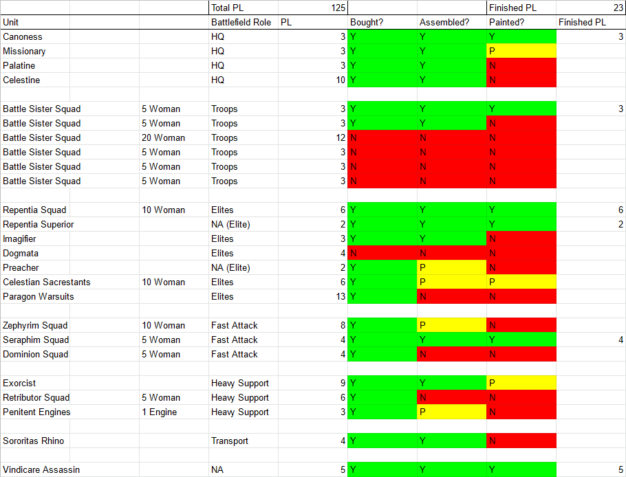 Credit: Evan "Felime" SiefringI started the week off strong by finishing up a partially painted squad of Sisters and my converted Palatine. Another 6 PL on the scoreboard!