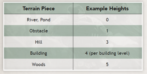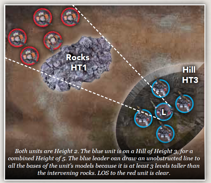- If any other units or terrain types in the way are the same Height or greater than both the unit drawing LOS and the target unit, then LOS is Blocked.