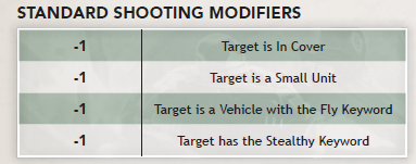 Next, we look at the Shoot characteristic of the unit. This is our target. We add or subtract any modifiers necessary - they are listed here so you can see them. 1s always miss, 8s always hit. If for some reason you need higher than an 8, you just half the total number of dice and hit on an 8.
