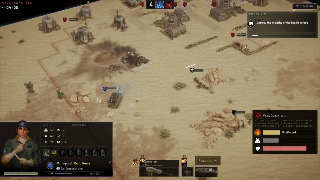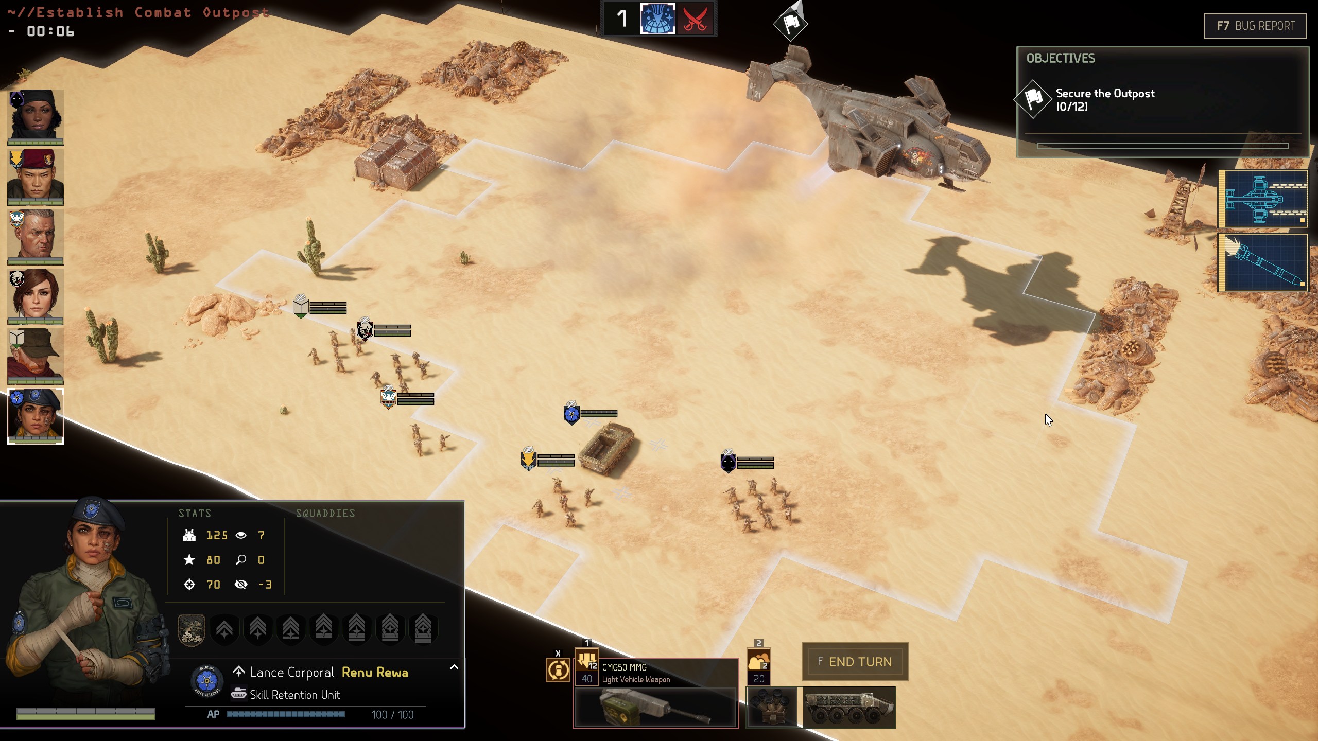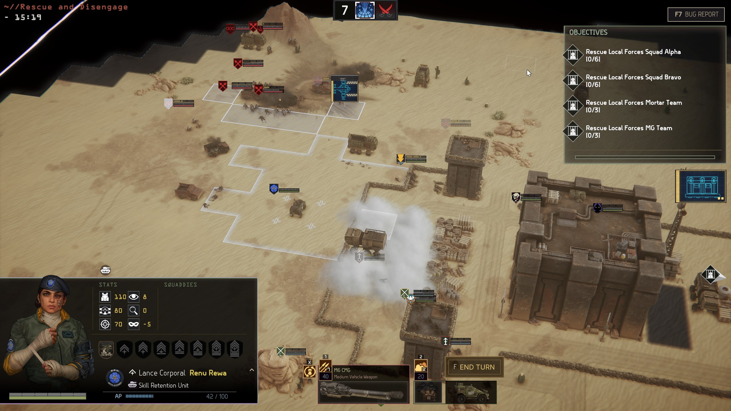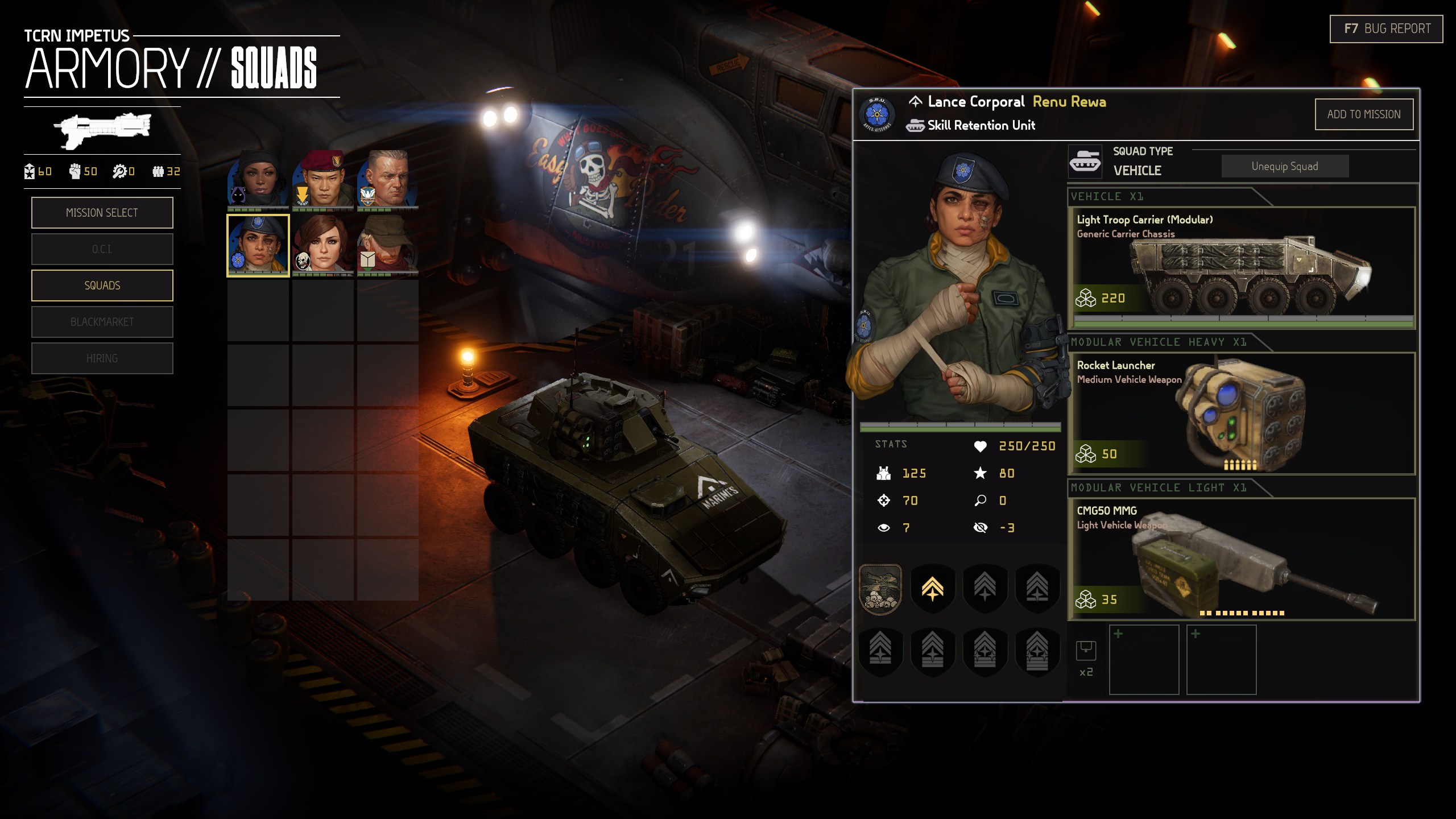 Menace breaks from tradition by ramping the scale of engagements up from individual squads to platoons. The demo caps out at five squads and a vehicle per deployment, but the full game promises more leeway. That's a much larger allocation than squad-oriented frontrunners like XCOM 2, Gears Tactics or Jagged Alliance 3. Vehicles are treated like squads. A vehicle is one unit and you get a vehicle commander in lieu of squad leaders. They get a perk tree. The only vehicle commander in the demo is Renu Rewa, who has PTSD-related anger issues and should be receiving treatment in a mental health facility. But they put her behind the wheel of an APC with autocannons instead. Good call.