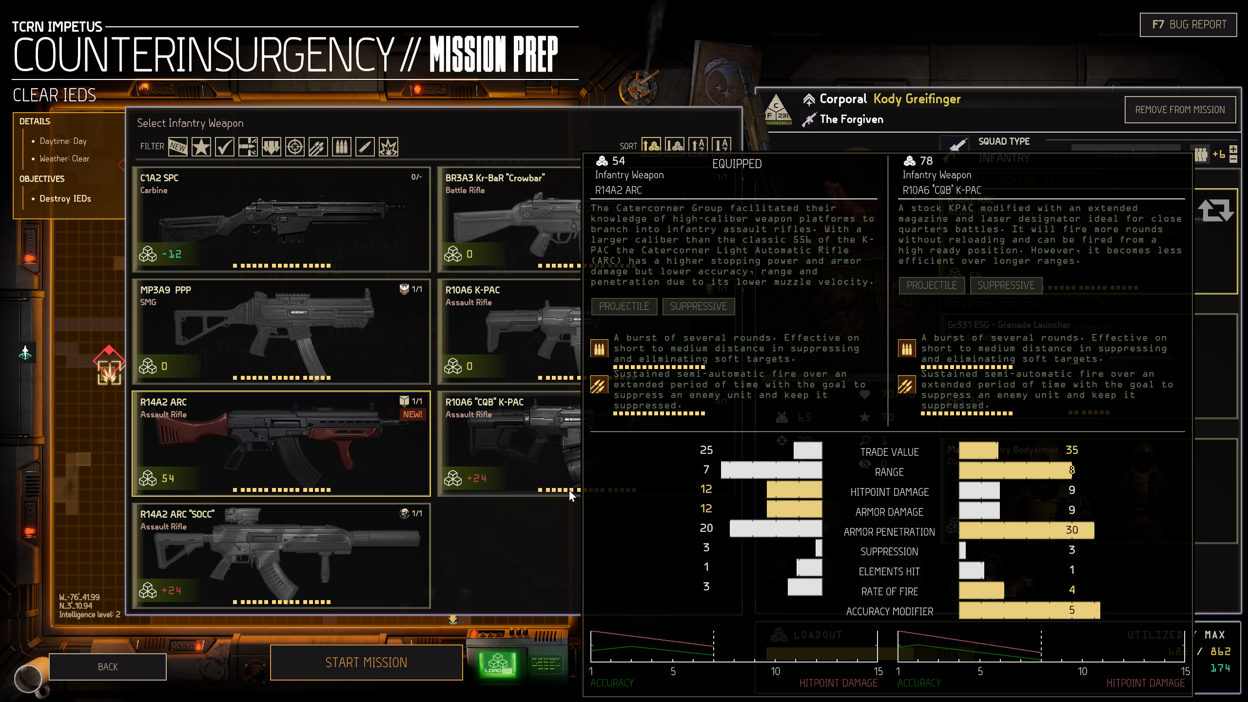 Every single item has a point cost. Every weapon has a breakdown of usage, stats, and even effective range graphs. This is a planner's dream.I spent my first few playthroughs dumping points into a few jacked-up superheavy squads with the best armour and weaponry. This worked to a point. My squads were beefy and impossible to shift once they got into position. But they were also permanently outnumbered 4-to-1 and got outplayed in action economy and mobility. I wasn't playing to mission prep's strengths, which is the ability to tailor everything. The granularity of the points system is a thing to behold. It's not as finicky as 'mech fitting in BattleTech/MechWarrior games (no stain on that, I love it), but it's much more detailed than a basic slot layout like XCOM: Enemy Unknown.