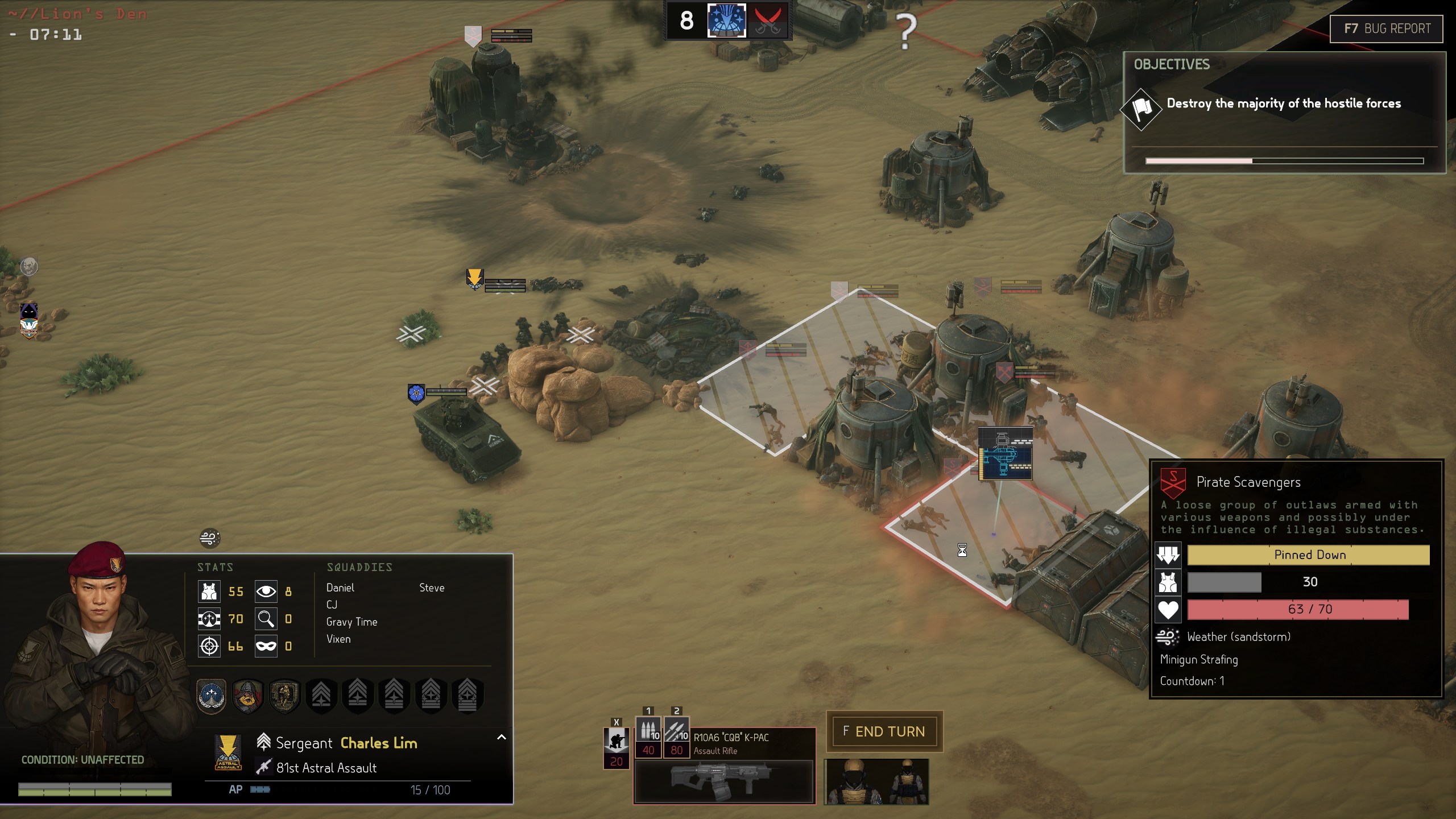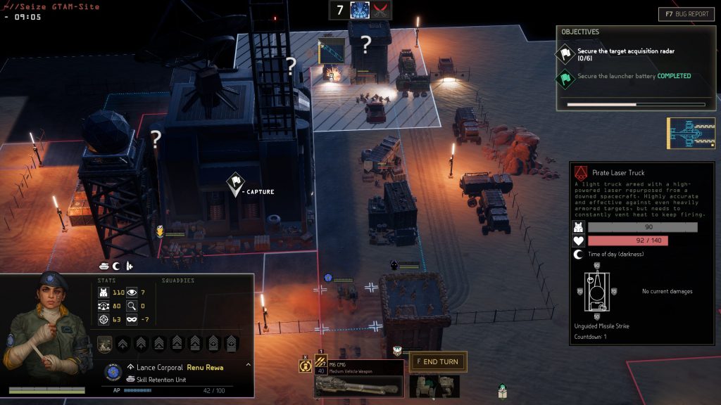 Combat in Menace is further accessorised by complex, but intuitive secondary systems. Different terrain types impose different AP requirements to cross. Terrain is destructible. A heavy rocket leaves a crater that provides cover. A wrecked building still provides limited protection. Dust storms make the entire battlefield more hostile. Nighttime reduces everyone's vision radius and concealment – unless you have night-vision gear. A trail of fire left by a damaged flamethrower truck is hazardous to infantry well-being. Any of these concepts warrants a long Reddit post about coping and turning it to your advantage. But once you make contact, it's just part of the game. The battlefield develops (and collapses) as combat drags on and it's on you to adapt.