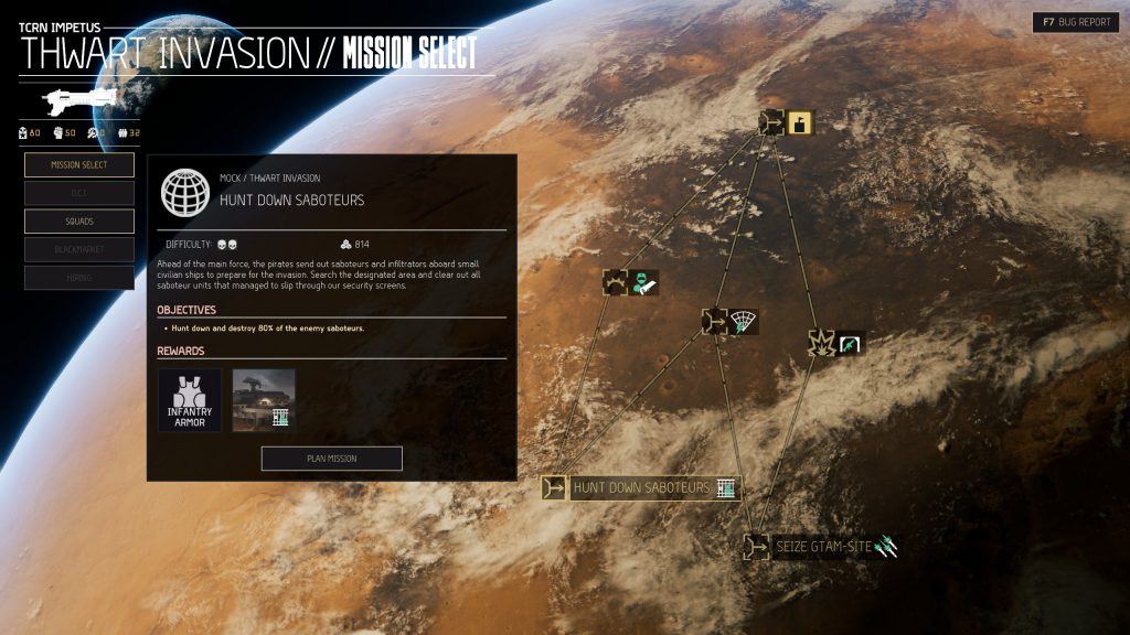 The default use of branching mission chains makes each engagement more meaningful.This is a game about planning and it's proud of that fact. Chaining missions into operations forces players to consider each tactical battle a part of the larger whole. Unlike Mechanicus or XCOM, most of your deployments in Menace aren't one-off resource-management puzzles. Here, casualties and injuries persist between missions. Vehicles that suffer damage retain it until they're repaired. A critical support reward (like reinforcements) can carry you through the next mission. The branching paths appear simple, but conceal a thoughtful gameplay loop unto themselves.
