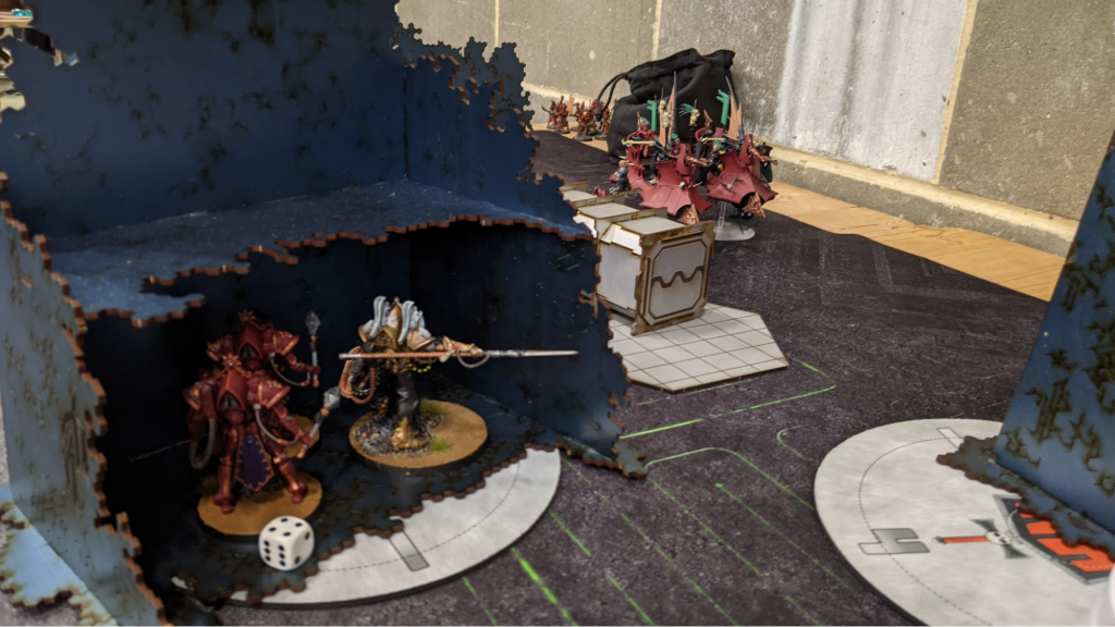 Definitely not afraid of the Drukhari Dark Lances, Vahl and her bodyguards hold down a hotly contested objective. The Archon and Drazhar charge Stern and Vahl respectively, and through sheer luck I manage to kill both! The Archon falls to the powerful combo of Stern’s invulnerable ignoring sword and Kyganil’s fight first ability allowing her to cut him down with relative ease. This is a bit of a hot point, as Tom is understandably a bit frustrated by that, and whilst I’m pretty sure I did warn him about it I couldn’t say for sure. I feel a bit bad here, as I don’t know for certain that I did mention this, so I’m worried that I’ve won the moment off the back of dodgy play. Vahl pays 2CP and interrupts between Drazhar’s fights and sucessfully lands all 5 wounds with her lunge profile, with four of those rolling a 6 (and so doing a mortal wound as well), doing a huge amount of damage and cutting him down as well.