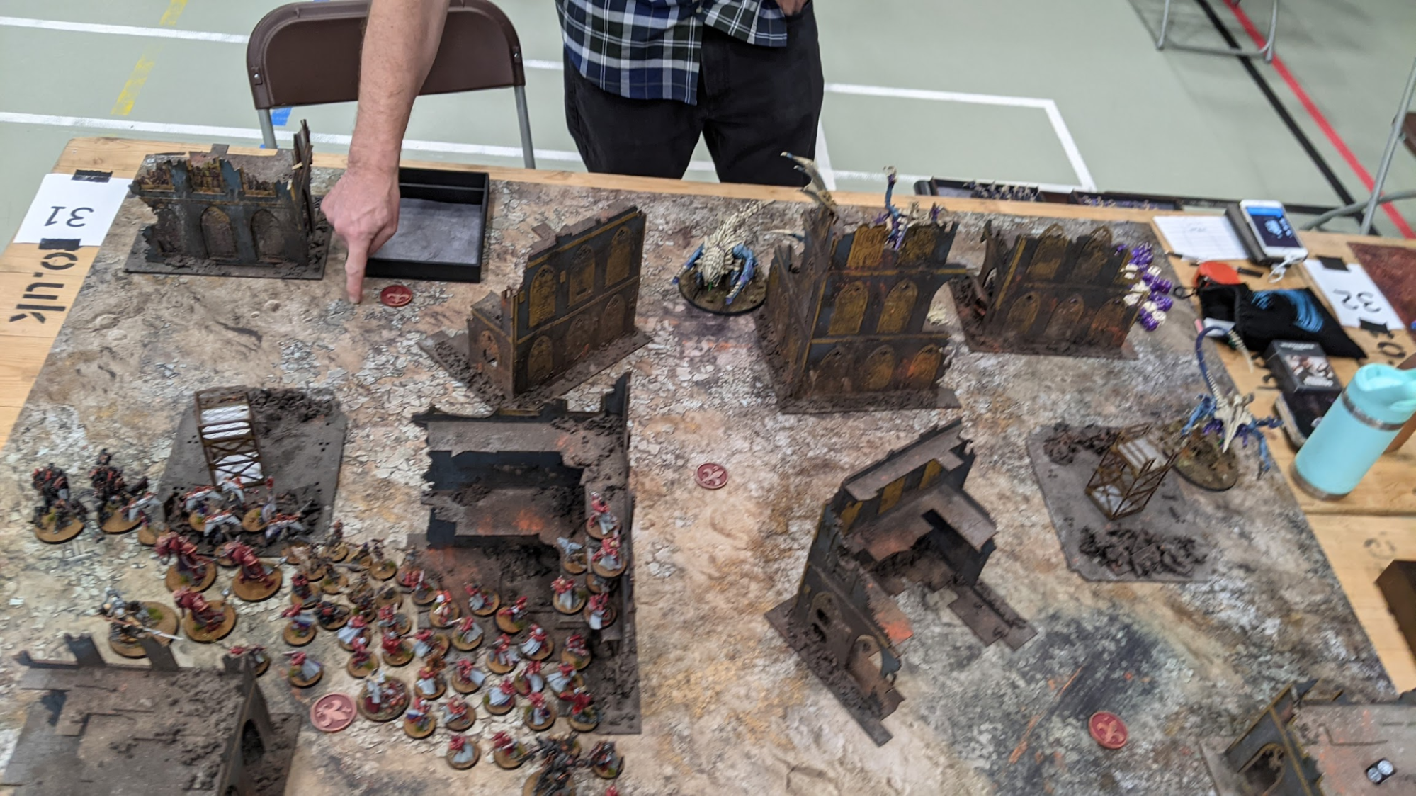 I hang on through another punishing Necron turn, and get to Turn 3, where I manage to scrape a few points from ROD and DtS, but I’ve basically run out of bodies, and we talk out the last two turns. Joseph kindly gives me some feedback and pointers on what I could have done better, particularly around playing more cautiously and using units like Repentia to spring out of ruins onto targets and objectives, and we pack up. The early finish gives me some time to catch up with people a bit, and I find Soggy and Bair finishing up a game of Titanicus at the back of the hall, and then chat to Lupe about Sisters colour schemes for a bit before game 3.