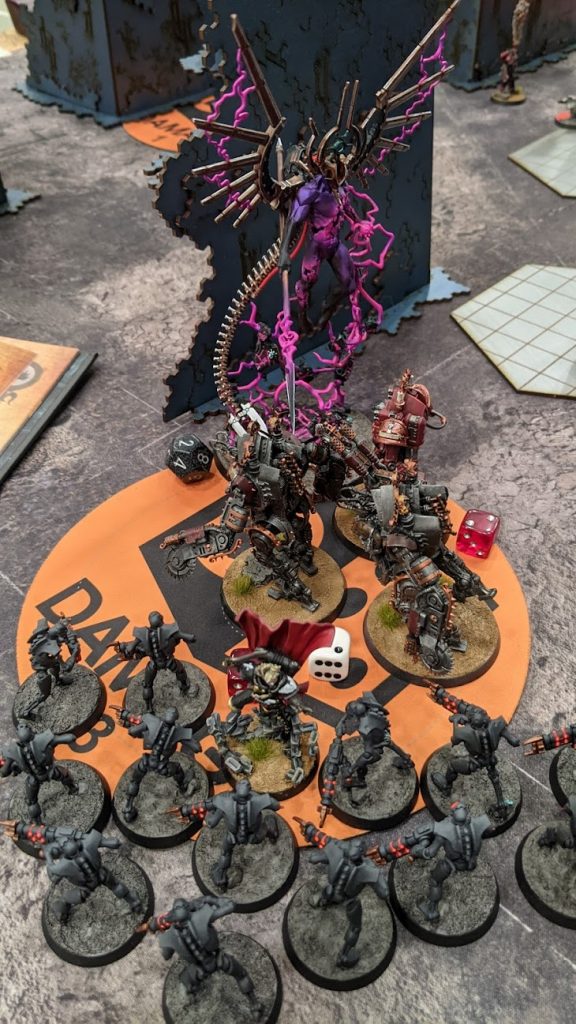 Joseph’s turn 1 is considerably more effective, as he storms out of the gate and wins the game immediately. Between both C’tan, Tomb Blades, and Skorpekhs there is so much stuff up in my face immediately, and he melts through two out of three Nundams and promptly murders Morvenn Vahl. At this stage I know I’ve lost. I’m on the back foot, and grasping for straws. Turn 2 I barely manage to score some primary still, but I’m off the shrine, and have lost a significant portion of my punch already. One Nundam bravely holds the Void Dragon for a turn before being disintegrated by the captive power of a god. The backfield’s fully zoned out, with no chance of sneaking in for a ROD or flipping an objective, and the Zephyrim, Stern and Repentia all show up, give things a go and then die pretty promptly.