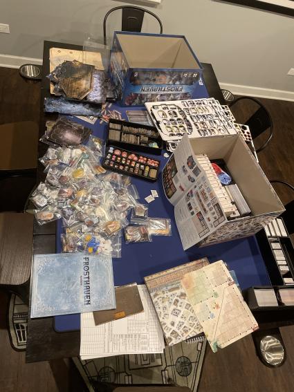 It's a lot of stuff. Credit: Tim DunnThen my kiddo graduated and went off to college, and we didn’t know how to continue with our speediest character on the other end of the state. It has sadly sat on the (lowest, for weight safety reasons) shelf in our game room, patiently waiting for the next winter or summer break when we’re all in the same house again. In the meantime, we saw the KS for Frosthaven drop. “Another Gloomhaven?” I asked. “Gloomhaven, on ice, bigger and better!” was the response. Surely not LITERALLY, PHYSICALLY bigger, right? Friends, they were not kidding.