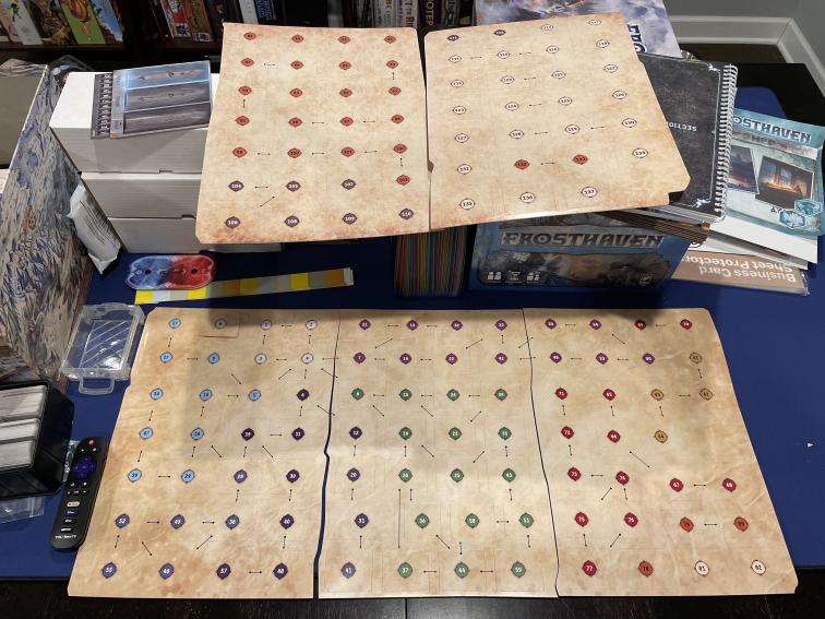 A branching map of scenarios adds a narrative "Choose Your Own Adventure" element. Credit: Tim DunnThe Frosthaven map is roughly twice the size of Gloomhaven and in addition to Road and Town events outside of the dungeon slaying scenarios, Frosthaven has Seasonal Events in which you will suffer with the effects of the relentless winters if you didn’t prepare yourself and fortify your town enough while in Summer Events. The loot isn’t all about Gold anymore, either. You can collect material and herbs to craft weapons, repair buildings, and formulate potions in order to come back stronger, more clever, and more dangerous than before.