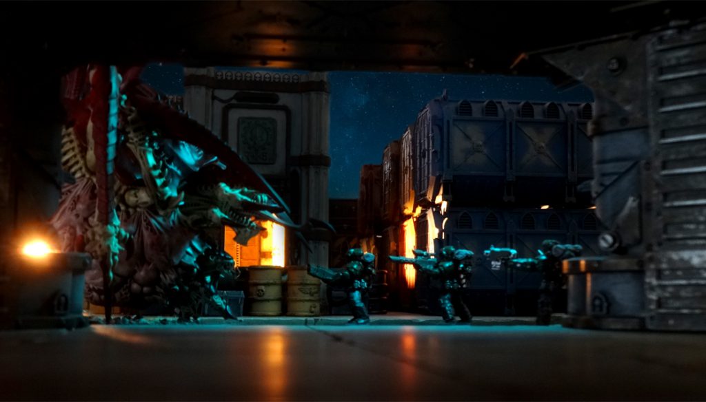 A Tervigon approaches some hapless Tempestus Scions. Credit: Charlie Brassley & Tom Saunders