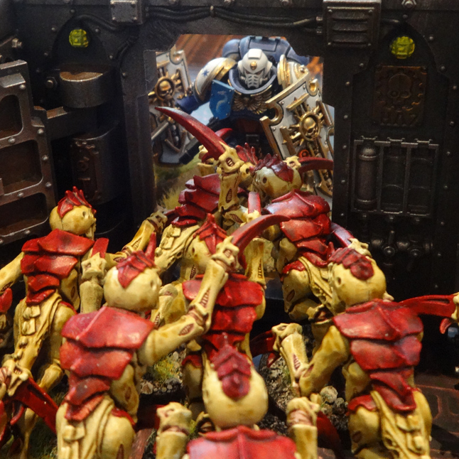 Brother Priahad of the Cobalt Scions' Bladeguard holds the door against a brood of hormagaunts. Credit: Charlie Brassley
