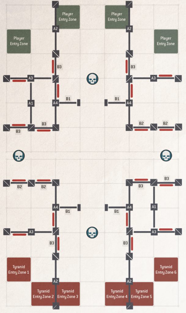 Since I'm probably only going to be able to have one Boarding Action mission in version 1 of Swarm, I picked a fairly basic one that applies to plenty of narrative contexts. That basic one is Access Junction Primus from Arks of Omen: Abaddon. The map itself is almost exactly the same as the official one, but for the addition of two extra spawn zones so that it's easy to figure out where respawning Tyranids should deploy. The mission itself is also somewhat adjusted, and forces the players to gain full domination of the map over the Tyranids, which also means casually hanging out right on top of their spawn zones for at least a turn. It's like playing in traffic, if traffic had sword hands and beetle guns.