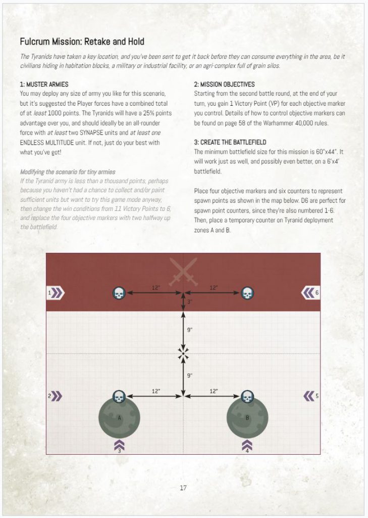 Right now I'm sorting the basic layout, hopefully placing it firmly halfway between looking like the garage band project that it is, and the official Warhammer 40,000 supplement I wish it was. Here's an example of the very first mission I wrote, Retake and Hold, in the new layout: