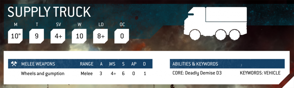 Convoy escort duty is an absolute classic, so writing this was high up my hit list. You need to safeguard up to three trucks through a wall of chitinous death.I'll be particularly interested to get feedback on this one, as the trucks are fairly squishy as vehicles go, but it's still a trio of hulls to chew through. The rules make it clear you can use whatever APC, cardboard template or comatose pet you like to represent them, but obviously I simply had to produce a datasheet for them: