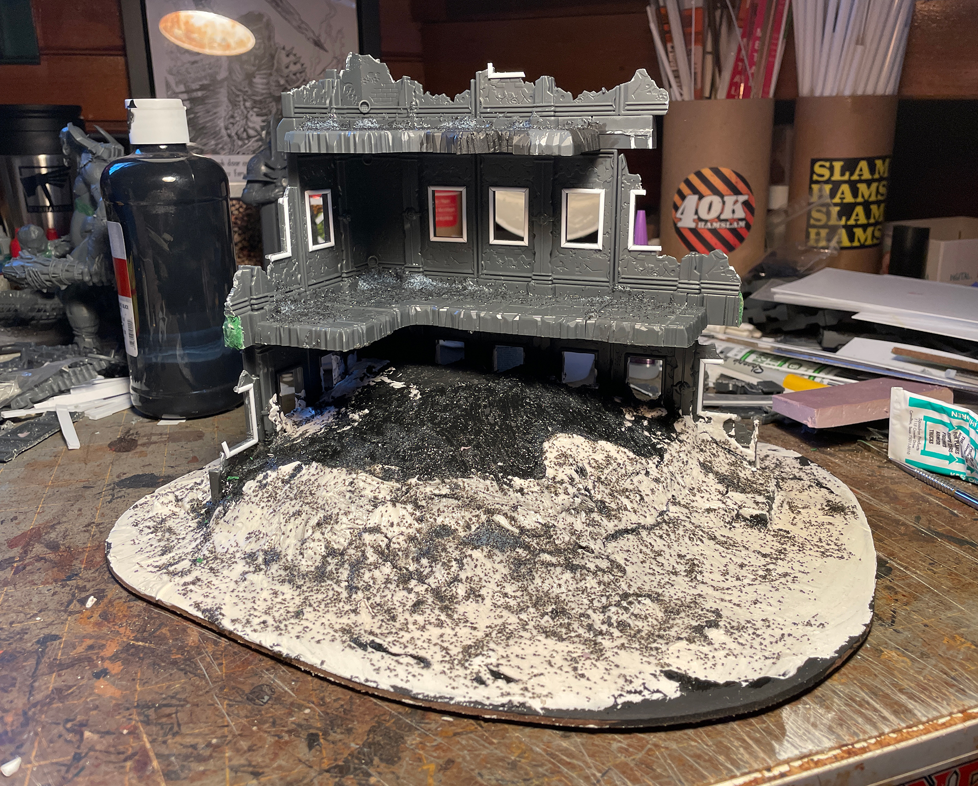 Credit: DylanAfter that was dry, I was left with a few cracks where I laid the spackle on thick, so I broke out the texture paste again and painted it all over and this time, added build up to the upper floors, so it would appear that ash had collected up there as well.