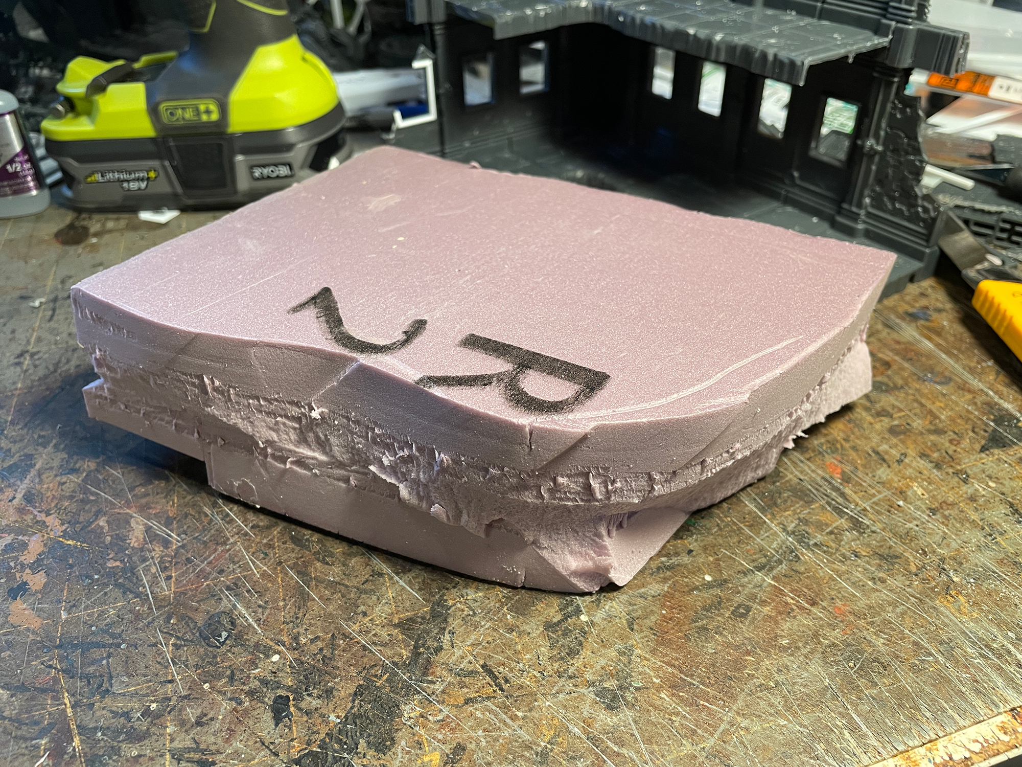 Credit: DylanAfter that, time for more rough shaping. I continued carving it to to get it in the rough shape I wanted: invoking the drifting ash getting stopped by the building, filling it up, and then spilling out through the open windows.