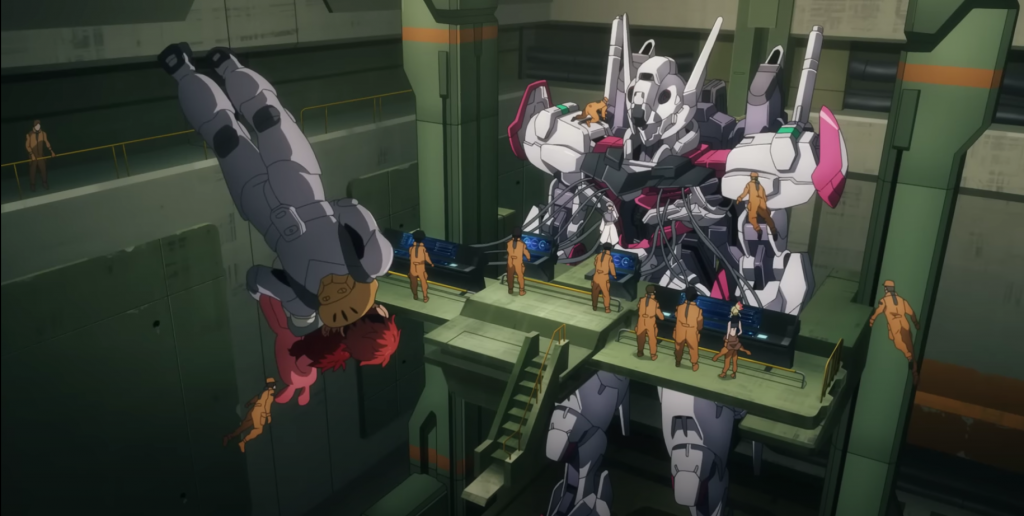 The Witch From Mercury breaks bold new ground in Gundam’s habit of everyone being way too young for this shit: the protagonist, Eri, is four. The episode is set during her birthday party, which her parents bail on for work. They’re mobile suit designers/pilots, par for the course in these parts, so Eri wanders off to scream at the parked Gundam, because it’s clearly their favorite child. Stop me if you’ve heard this before, but it’s a wildly advanced prototype that no one has ever seen before and only the child is capable of piloting.