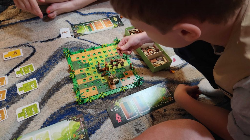Being Lego there's very little risk of anything falling over and besides that's not the point of the game anyways, regardless of how much this may resemble Rhino Hero. Instead, the game ends when the bricks run out, at which banana points are tallied and the player with the most points is the winner. There are some Catan-like scoring bonuses you can snag, and planning your final turn around when the bricks will run out is key to finishing strong. There are different boards you can start with that change up the strategy and early builds a bit if you want some variety later on.