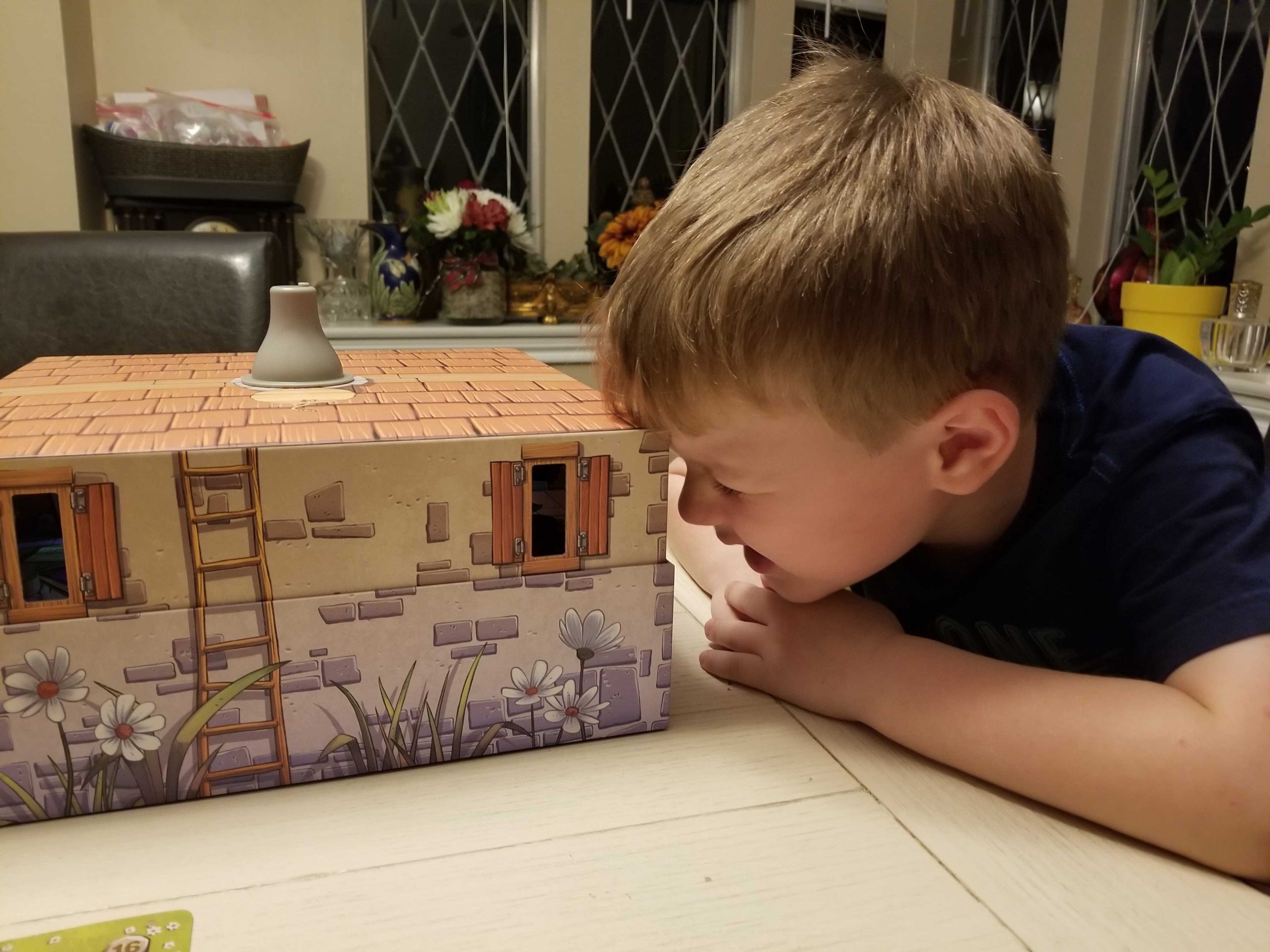 My son attempts to see inside the houseThe light stays on for around 60 seconds, during which players have to look for the objects that were dropped inside, note their locations, and remember them.