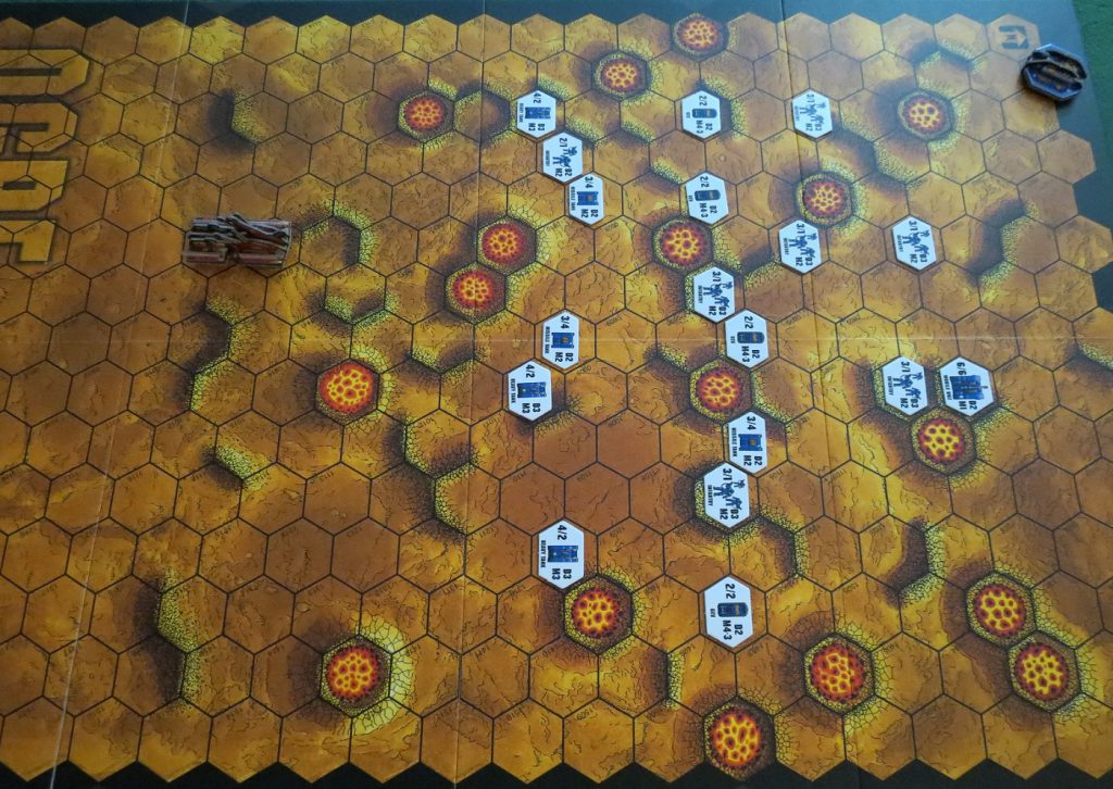 Despite just a touch of chrome, like how the GEVs get to move twice, rules are as lean as a Cormac McCarthy novel. That is, if he wrote bleak sci-fi instead of revisionist variations on the American western. It’s all very basic wargame fare where the key strategy is to combine units to get a better X:Y strength ratios against the defender, resulting in better outcomes on a simple D6 powered combat resolution table. Humans and their fragile vehicles, which include numerous tanks and missile carriers, generally go splat in a single hit. But the Ogre player had to track system damage to each weapon and the treads, making this game something of a precursor to the damage mechanics in BattleTech and also an inheritor of more complex WWII tank simulations where things like the armor slope on the hull of a Sherman matter.
